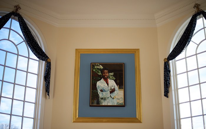 Carson's walls are covered with dozens of news clippings, honorary degrees and photos of him alongside various celebrities, dignitaries and world leaders — as well as full-size paintings featuring Carson proudly posing in his white coat alongside the lord Jesus Christ.
